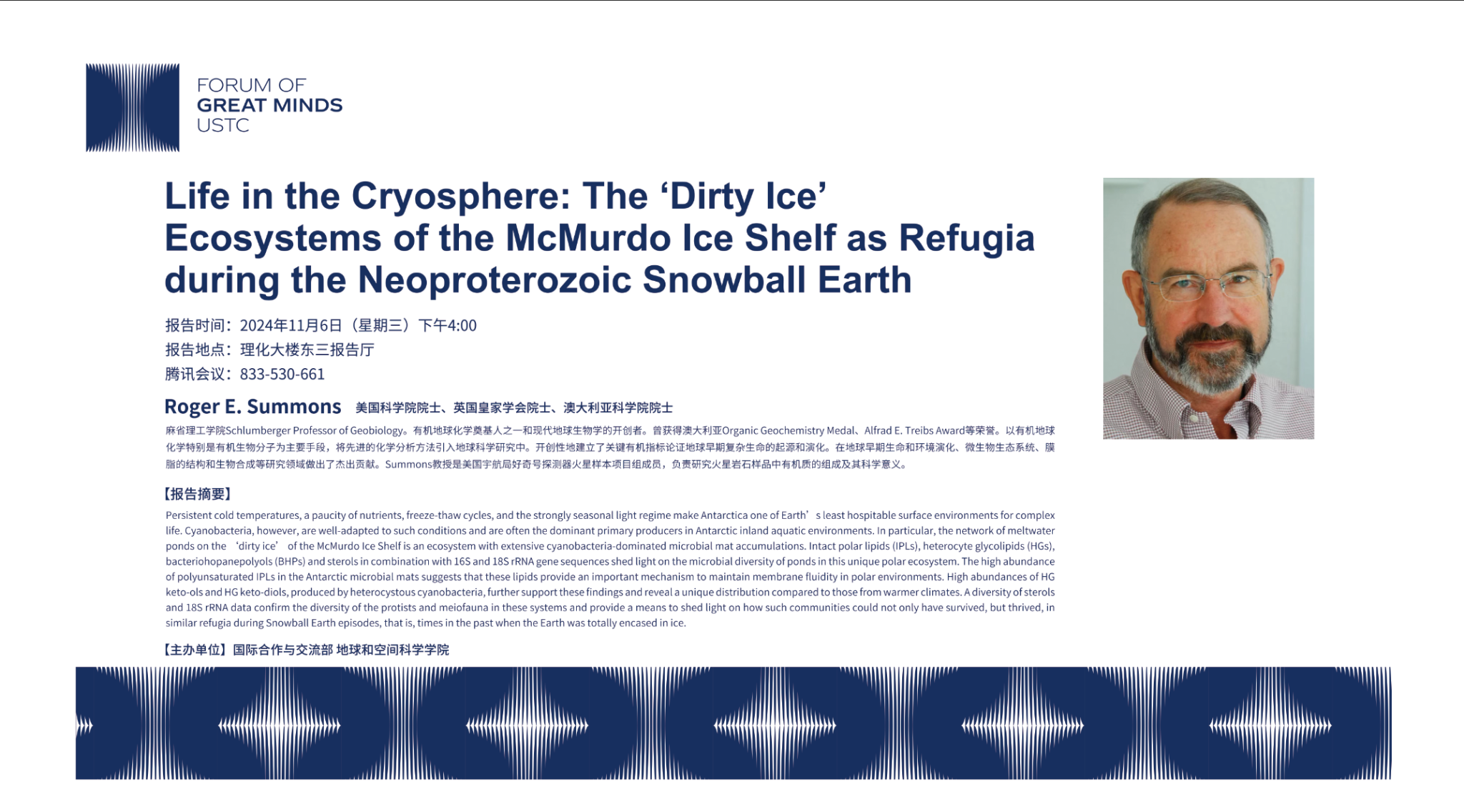 应学校邀请,美国科学院院士Roger E. Summons教授将于2024116日来校作“Life in the Cryosphere: The ‘Dirty Ice’ Ecosystems of the McMurdo Ice Shelf as Refugia during the Neoproterozoic Snowball Earth”学术报告。